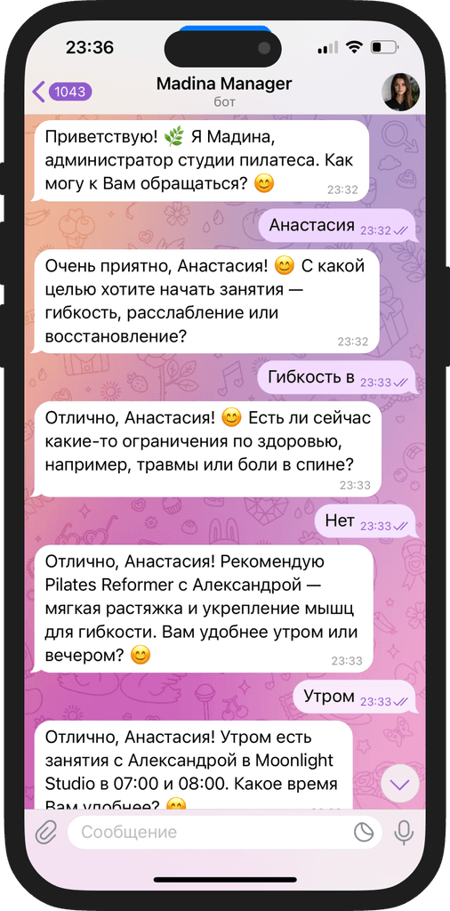 Умный ассистент помогает клиентам выбрать программу и тренера, записывает на занятия и принимает оплату. Если клиент пропустил тренировку — ассистент напоминает и предлагает новую дату, сохраняя мотивацию и регулярность.