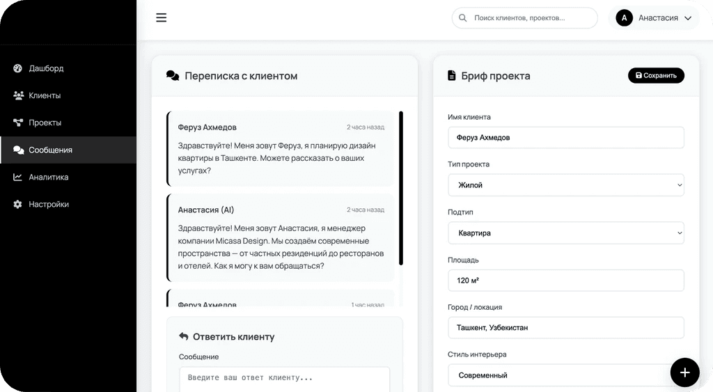 Клиент пишет в Instagram или Telegram - ИИ агент сразу отвечает, уточняет запрос, консультирует по услугам и подбирает удобное время. Все данные автоматически фиксируются в CRM.