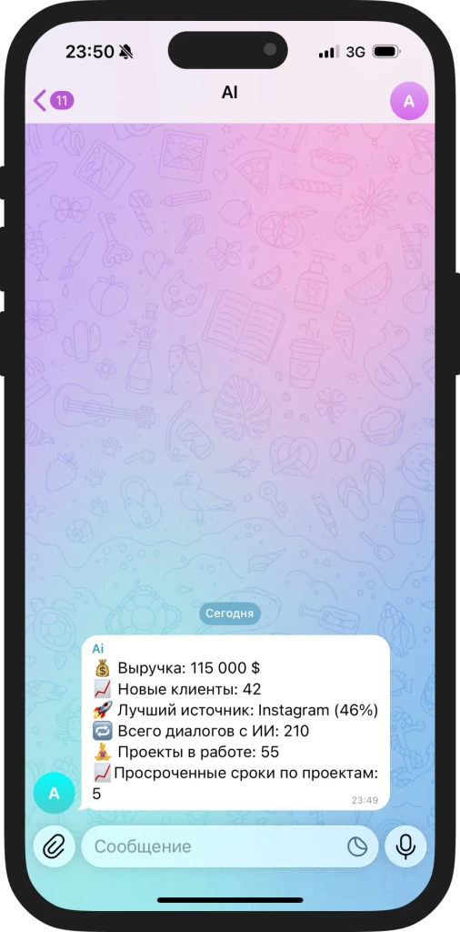 ИИ берёт на себя рутину: отвечает клиентам 24/7, вносит заявки в CRM и присылает ежедневные отчёты прямо в Telegram.